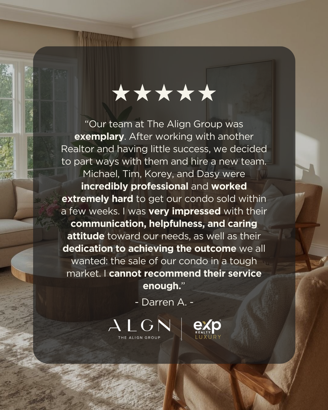 “Our team at The Align Group was exemplary. After working with another Realtor and having little success, we decided to part ways with them and hire a new team. Michael, Tim, Korey, and Dasy were incredibly professional and worked extremely hard to get our condo sold within a few weeks. I was very impressed with their communication, helpfulness, and caring attitude toward our needs, as well as their dedication to achieving the outcome we all wanted: the sale of our condo in a tough market. I cannot recommend their service enough.”