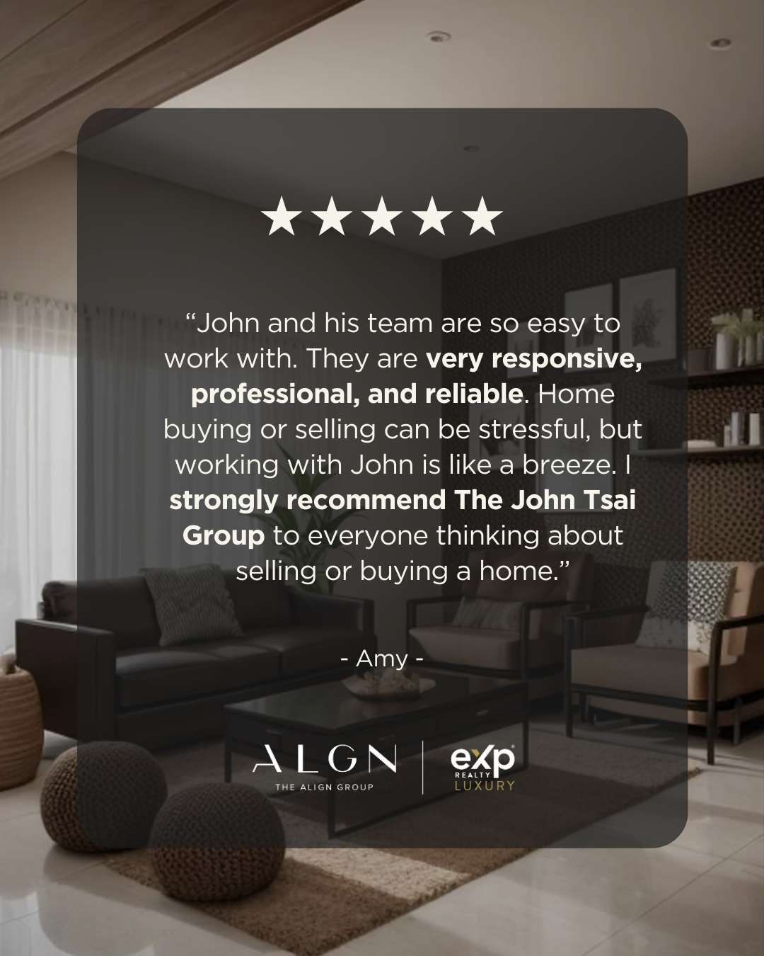 “John and his team are so easy to work with. They are very responsive, professional, and reliable. Home buying or selling can be stressful, but working with John is like a breeze. I strongly recommend The John Tsai Group to everyone thinking about selling or buying a home.”