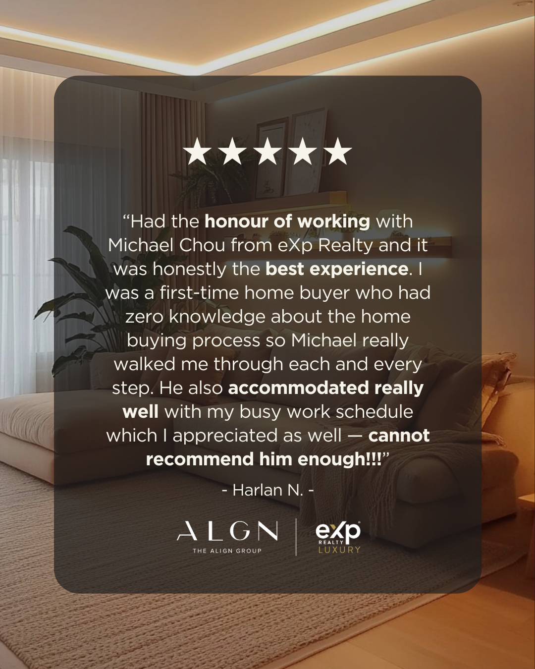 “Had the honour of working with Michael Chou from eXp Realty and it was honestly the best experience. I was a first-time home buyer who had zero knowledge about the home buying process so Michael really walked me through each and every step. He also accommodated really well with my busy work schedule which I appreciated as well — cannot recommend him enough!!!”