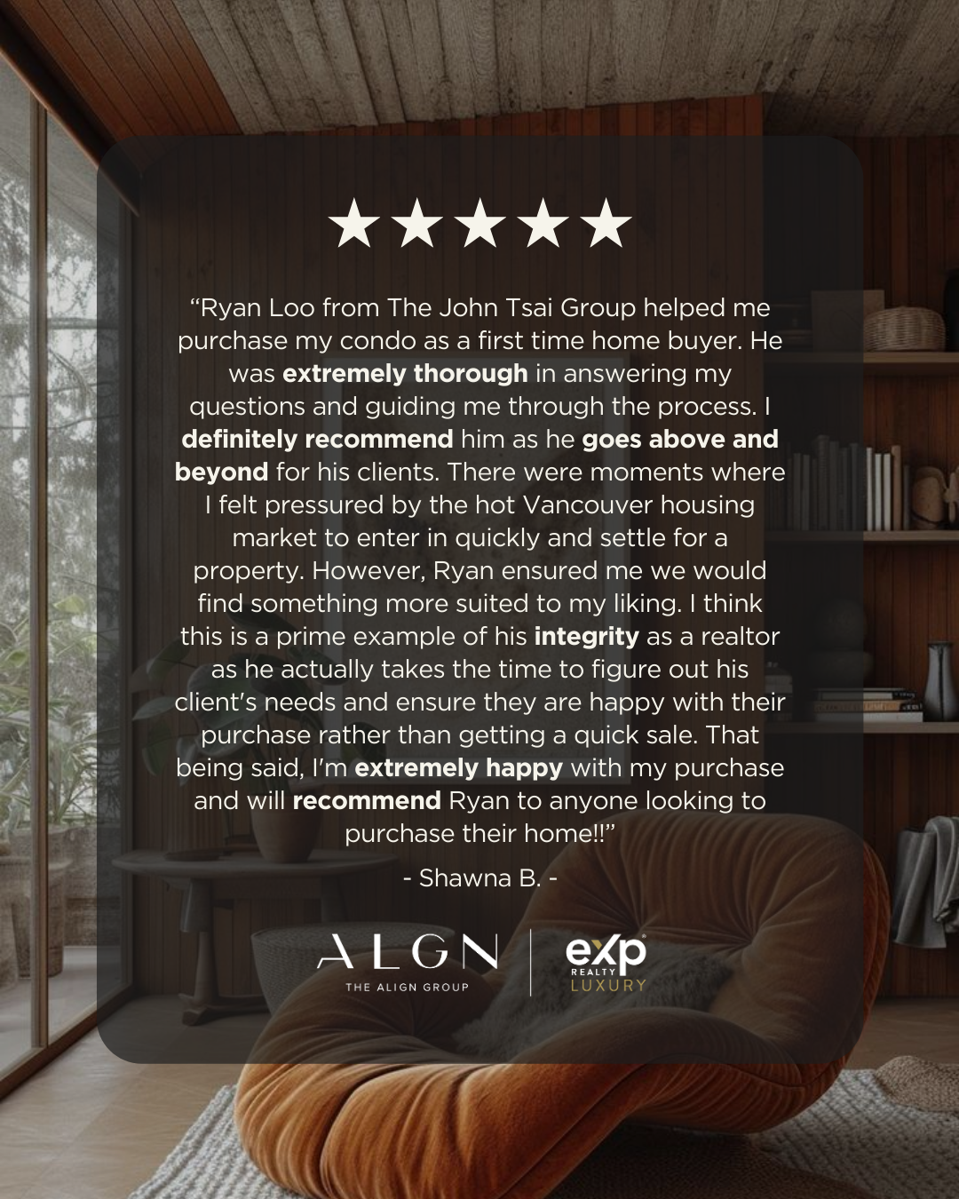 “Ryan Loo from The John Tsai Group helped me purchase my condo as a first time home buyer. He was extremely thorough in answering my questions and guiding me through the process. I definitely recommend him as he goes above and beyond for his clients. There were moments where I felt pressured by the hot Vancouver housing market to enter in quickly and settle for a property. However, Ryan ensured me we would find something more suited to my liking. I think this is a prime example of his integrity as a realtor as he actually takes the time to figure out his client's needs and ensure they are happy with their purchase rather than getting a quick sale. That being said, I'm extremely happy with my purchase and will recommend Ryan to anyone looking to purchase their home!!”