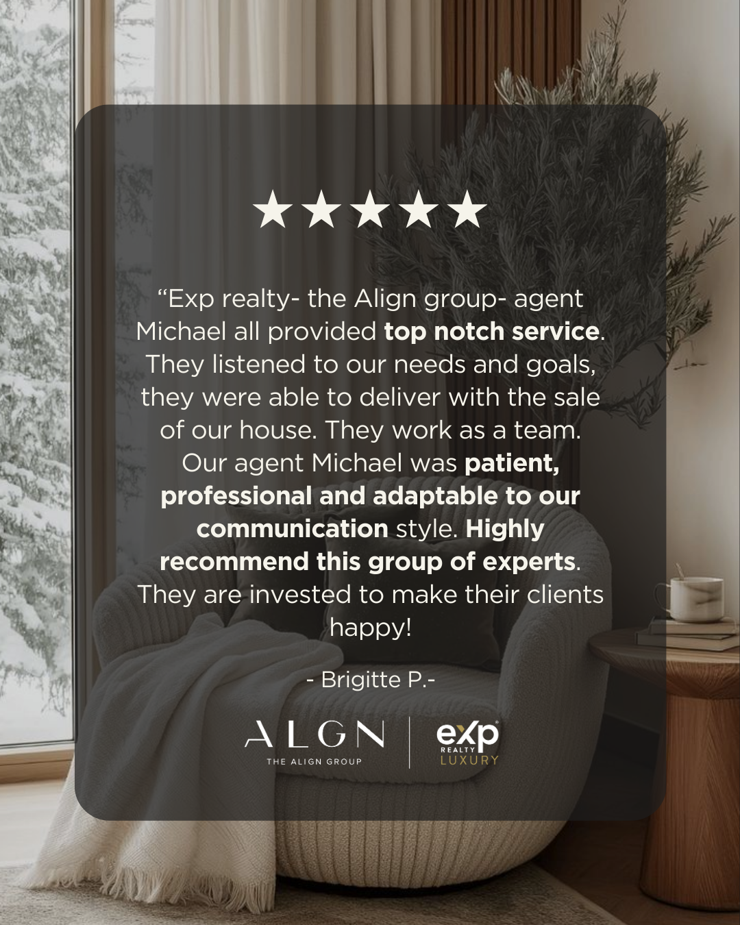 “Exp realty- the Align group- agent Michael all provided top notch service. They listened to our needs and goals, they were able to deliver with the sale of our house. They work as a team. Our agent Michael was patient, professional and adaptable to our communication style. Highly recommend this group of experts. They are invested to make their clients happy!"