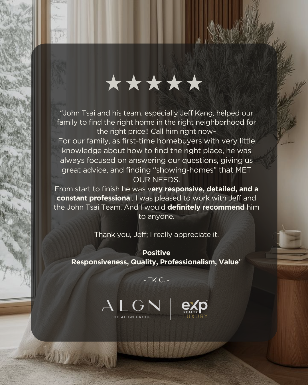 “John Tsai and his team, especially Jeff Kang, helped our family to find the right home in the right neighborhood for the right price!! Call him right now~