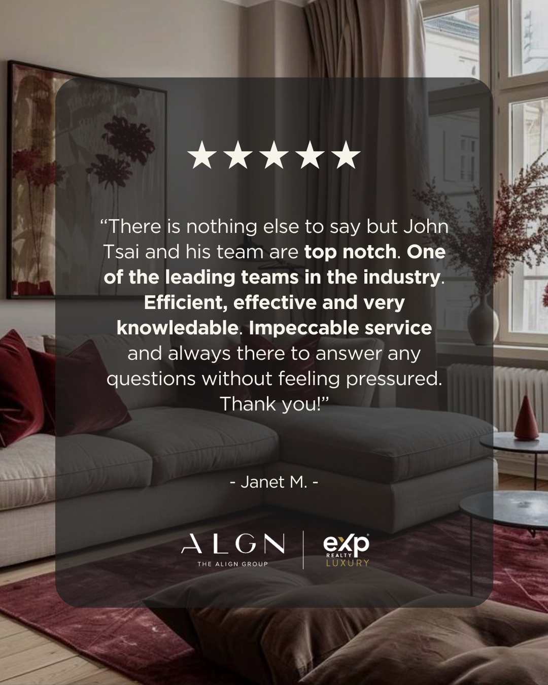 “There is nothing else to say but John Tsai and his team are top notch. One of the leading teams in the industry. Efficient, effective and very knowledable. Impeccable service and always there to answer any questions without feeling pressured. Thank you!”