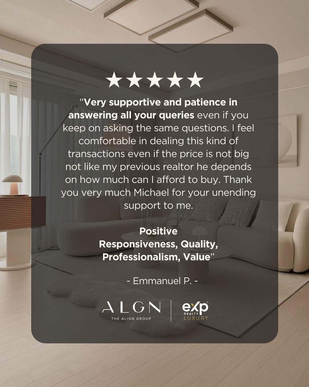 “Very supportive and patience in answering all your queries even if you keep on asking the same questions. I feel comfortable in dealing this kind of transactions even if the price is not big not like my previous realtor he depends on how much can I afford to buy. Thank you very much Michael for your unending support to me.