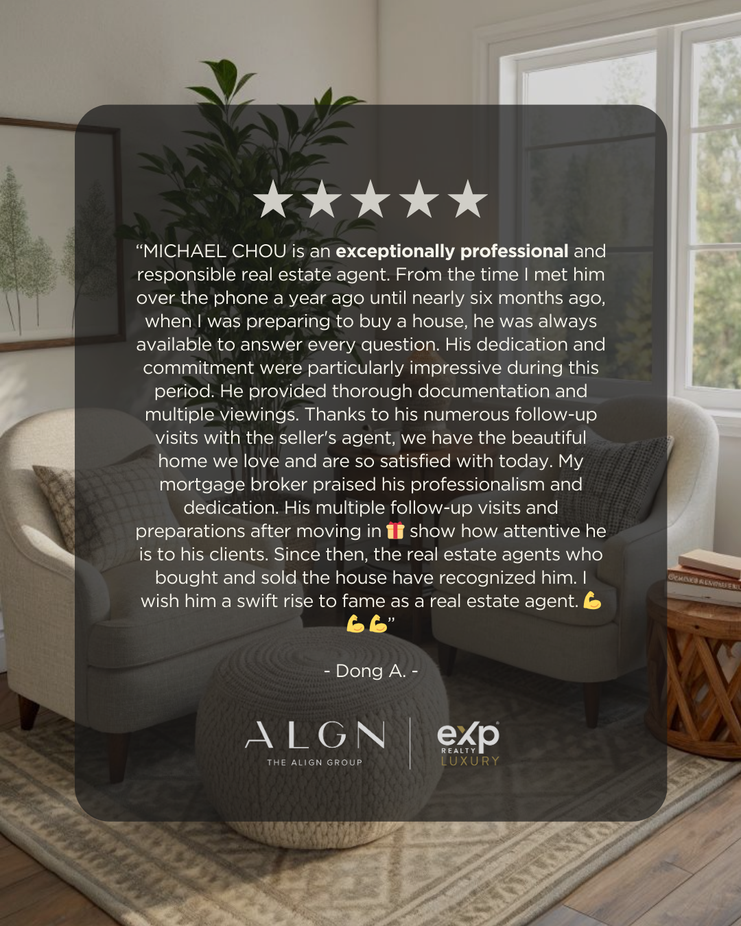 “MICHAEL CHOU is an exceptionally professional and responsible real estate agent. From the time I met him over the phone a year ago until nearly six months ago, when I was preparing to buy a house, he was always available to answer every question. His dedication and commitment were particularly impressive during this period. He provided thorough documentation and multiple viewings. Thanks to his numerous follow-up visits with the seller's agent, we have the beautiful home we love and are so satisfied with today. My mortgage broker praised his professionalism and dedication. His multiple follow-up visits and preparations after moving in 🎁 show how attentive he is to his clients. Since then, the real estate agents who bought and sold the house have recognized him. I wish him a swift rise to fame as a real estate agent. 💪 💪 💪”