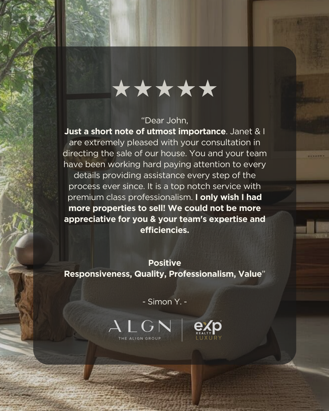 Just a short note of utmost importance. Janet & I are extremely pleased with your consultation in directing the sale of our house. You and your team have been working hard paying attention to every details providing assistance every step of the process ever since. It is a top notch service with premium class professionalism. I only wish I had more properties to sell! We could not be more appreciative for you & your team's expertise and efficiencies.