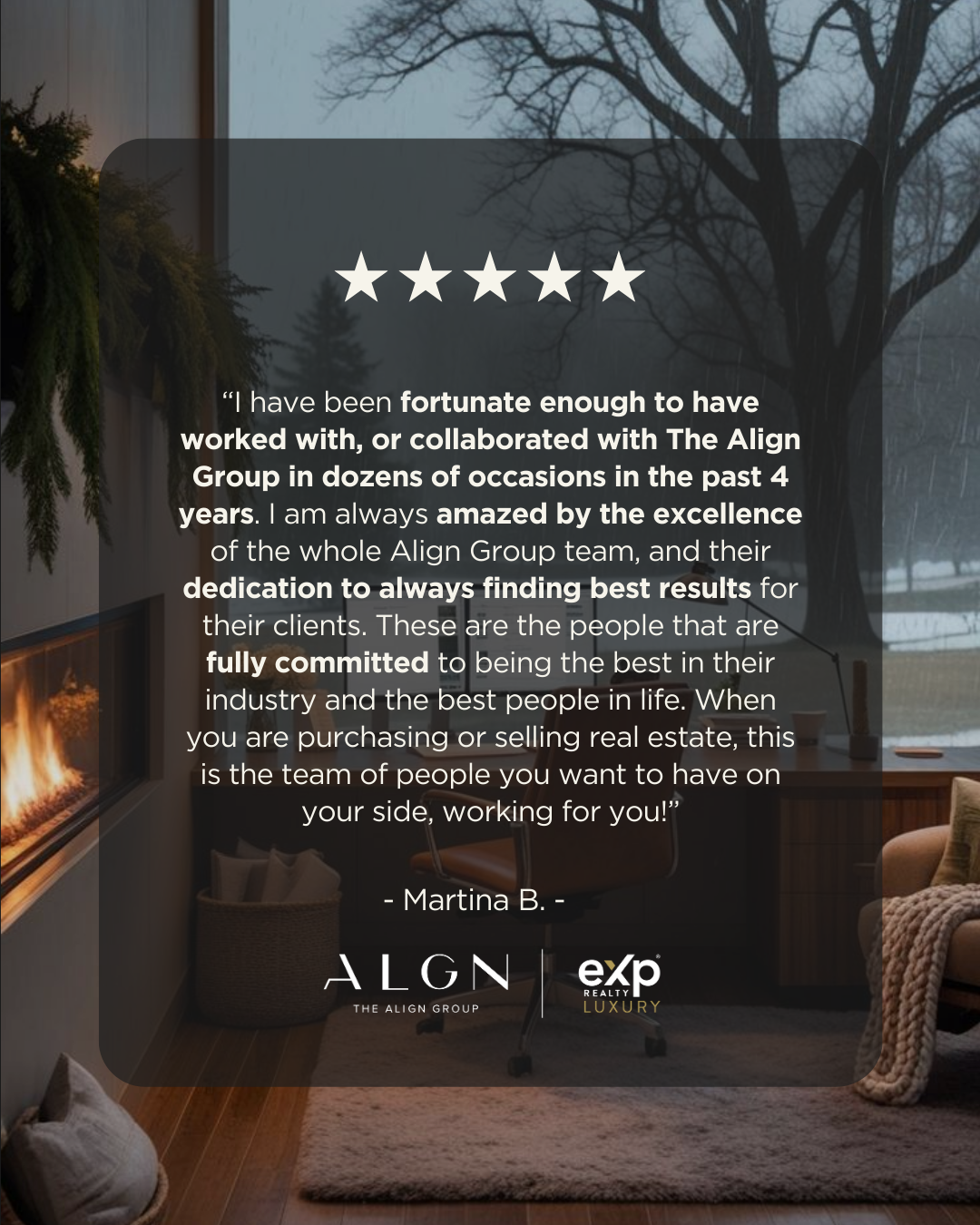 “I have been fortunate enough to have worked with, or collaborated with The Align Group in dozens of occasions in the past 4 years. I am always amazed by the excellence of the whole Align Group team, and their dedication to always finding best results for their clients. These are the people that are fully committed to being the best in their industry and the best people in life. When you are purchasing or selling real estate, this is the team of people you want to have on your side, working for you!”