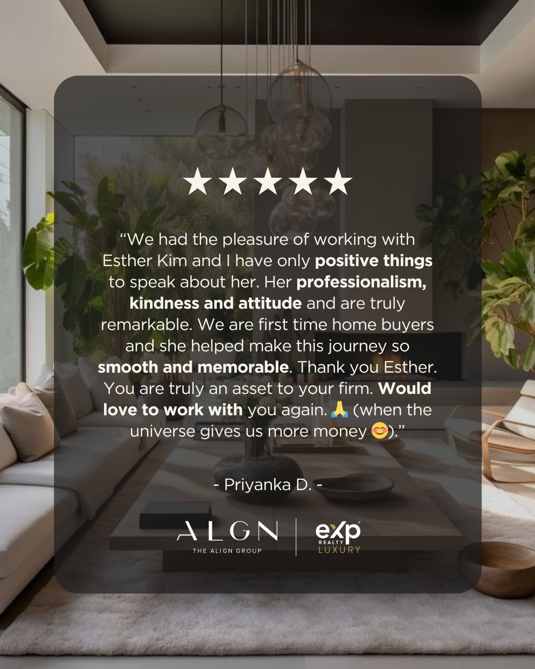 “We had the pleasure of working with Esther Kim and I have only positive things to speak about her. Her professionalism, kindness and attitude and are truly remarkable. We are first time home buyers and she helped make this journey so smooth and memorable. Thank you Esther. You are truly an asset to your firm. Would love to work with you again. 🙏 (when the universe gives us more money 😊).”