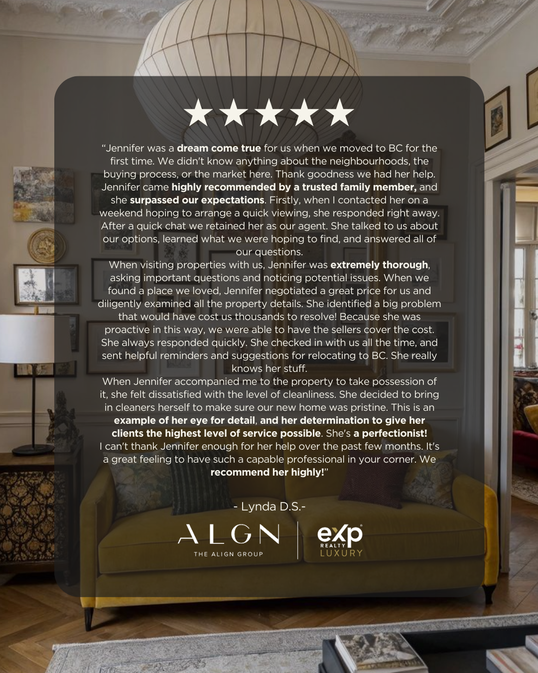 “Jennifer was a dream come true for us when we moved to BC for the first time. We didn't know anything about the neighbourhoods, the buying process, or the market here. Thank goodness we had her help. Jennifer came highly recommended by a trusted family member, and she surpassed our expectations. Firstly, when I contacted her on a weekend hoping to arrange a quick viewing, she responded right away. After a quick chat we retained her as our agent. She talked to us about our options, learned what we were hoping to find, and answered all of our questions. When visiting properties with us, Jennifer was extremely thorough, asking important questions and noticing potential issues. When we found a place we loved, Jennifer negotiated a great price for us and diligently examined all the property details. She identified a big problem that would have cost us thousands to resolve! Because she was proactive in this way, we were able to have the sellers cover the cost. She always responded quickly. She checked in with us all the time, and sent helpful reminders and suggestions for relocating to BC. She really knows her stuff. When Jennifer accompanied me to the property to take possession of it, she felt dissatisfied with the level of cleanliness. She decided to bring in cleaners herself to make sure our new home was pristine. This is an example of her eye for detail, and her determination to give her clients the highest level of service possible. She's a perfectionist! I can't thank Jennifer enough for her help over the past few months. It's a great feeling to have such a capable professional in your corner. We recommend her highly!”