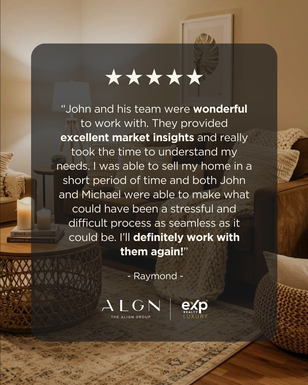 “John and his team were wonderful to work with. They provided excellent market insights and really took the time to understand my needs. I was able to sell my home in a short period of time and both John and Michael were able to make what could have been a stressful and difficult process as seamless as it could be. I’ll definitely work with them again!”
