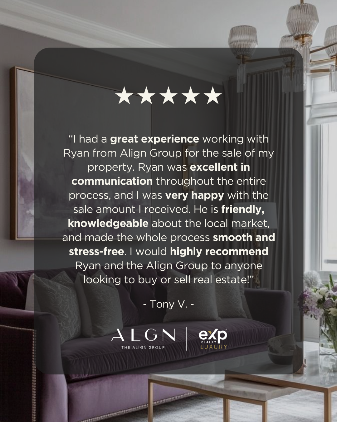 “I had a great experience working with Ryan from Align Group for the sale of my property. Ryan was excellent in communication throughout the entire process, and I was very happy with the sale amount I received. He is friendly, knowledgeable about the local market, and made the whole process smooth and stress-free. I would highly recommend Ryan and the Align Group to anyone looking to buy or sell real estate!”