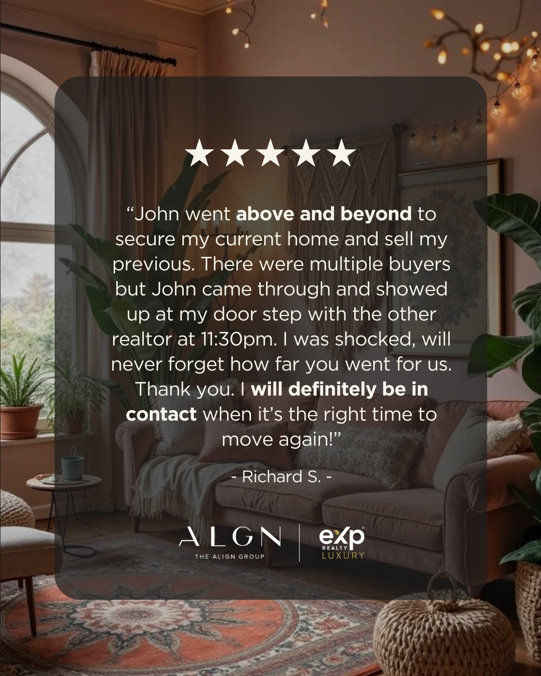 “John went above and beyond to secure my current home and sell my previous. There were multiple buyers but John came through and showed up at my door step with the other realtor at 11:30pm. I was shocked, will never forget how far you went for us. Thank you. I will definitely be in contact when it’s the right time to move again!”
