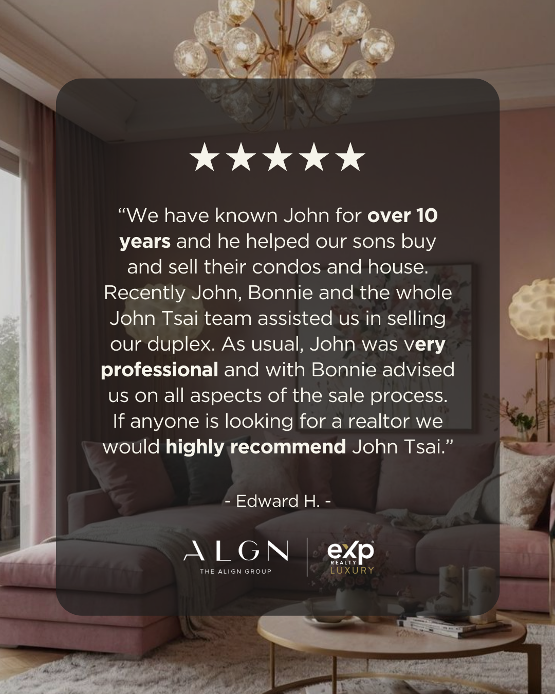 Recently John, Bonnie and the whole John Tsai team assisted us in selling our duplex. As usual, John was very professional and with Bonnie advised us on all aspects of the sale process.